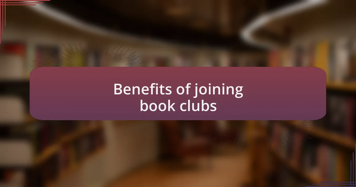 Joining a book club opens up a plethora of benefits that can truly enhance our reading experience. For instance, I distinctly recall how a single conversation about a novel helped me unravel layers of meaning I had initially overlooked. Have you ever found yourself in a discussion that transformed your understanding of a character or a plot? This type of interaction not only deepens your appreciation for the book but also makes you feel more connected to the narrative.